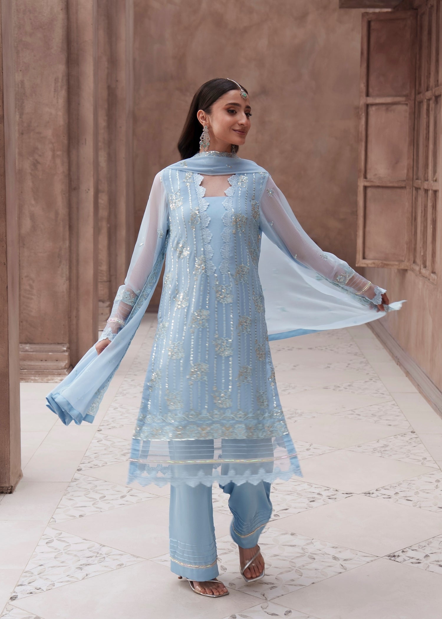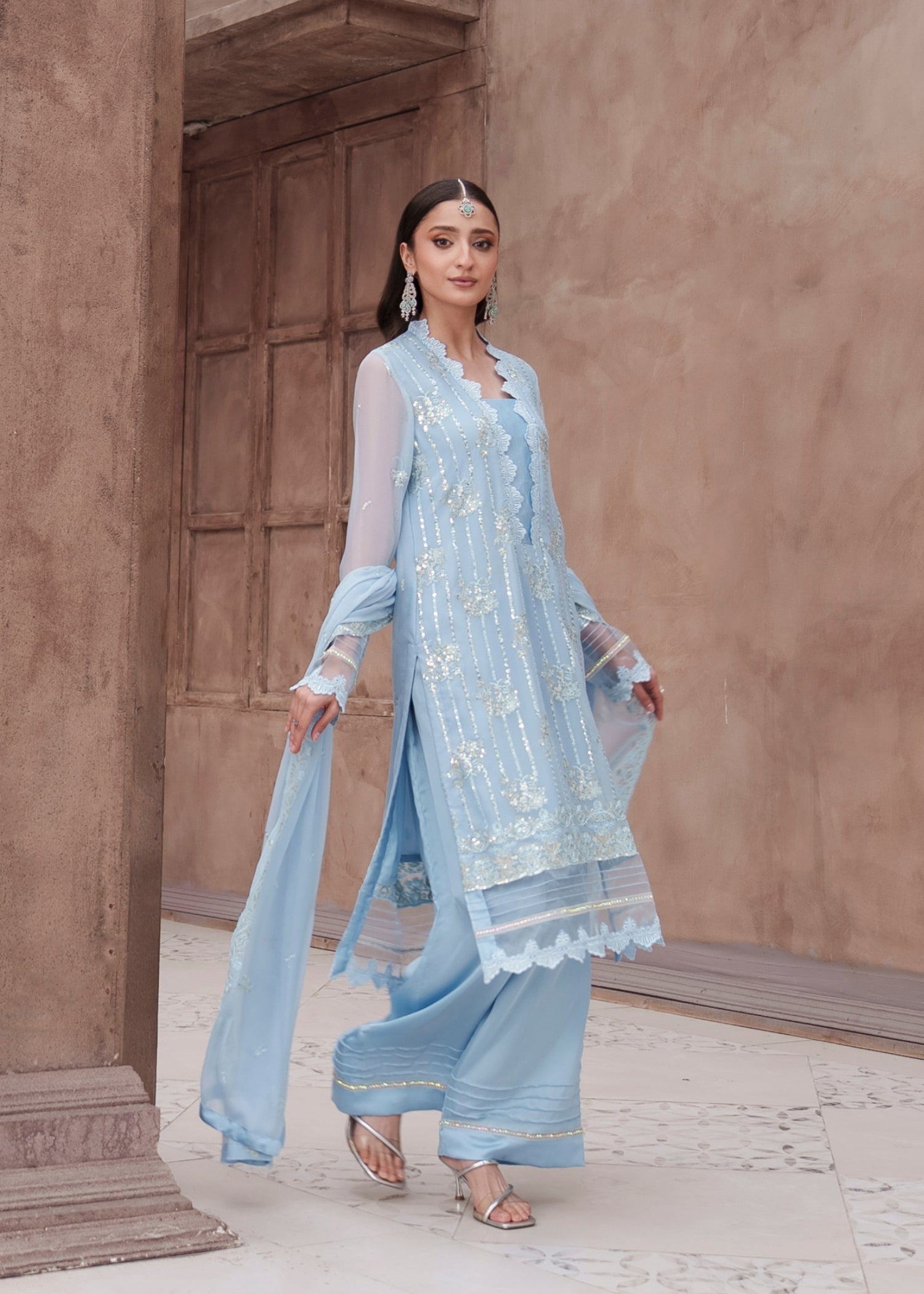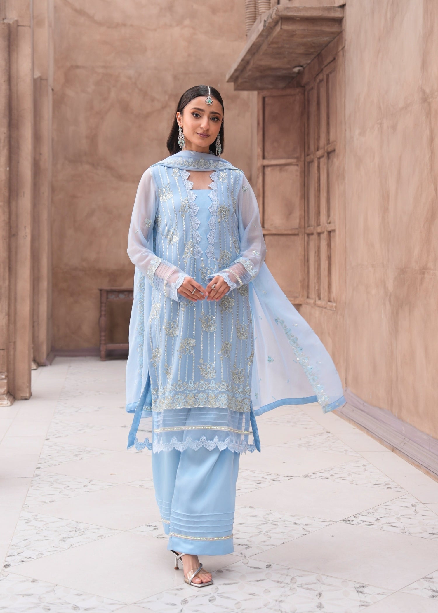 Chiffon shirt and dupatta with silk pants. Lightweight, comfortable, and easy to accessorize.