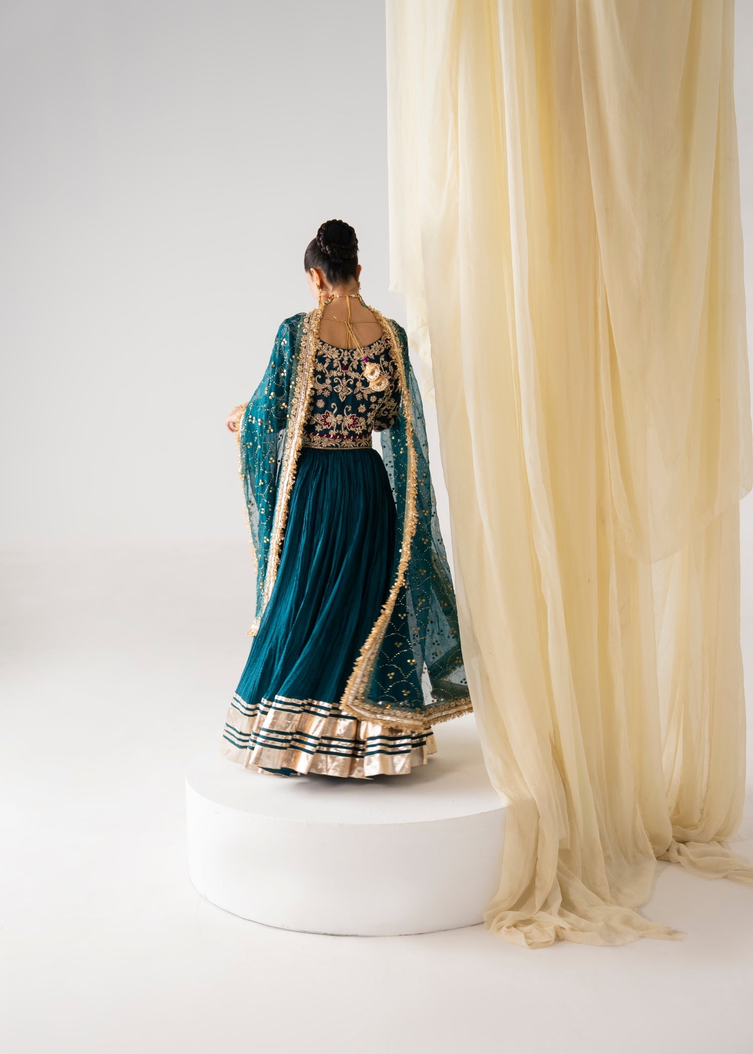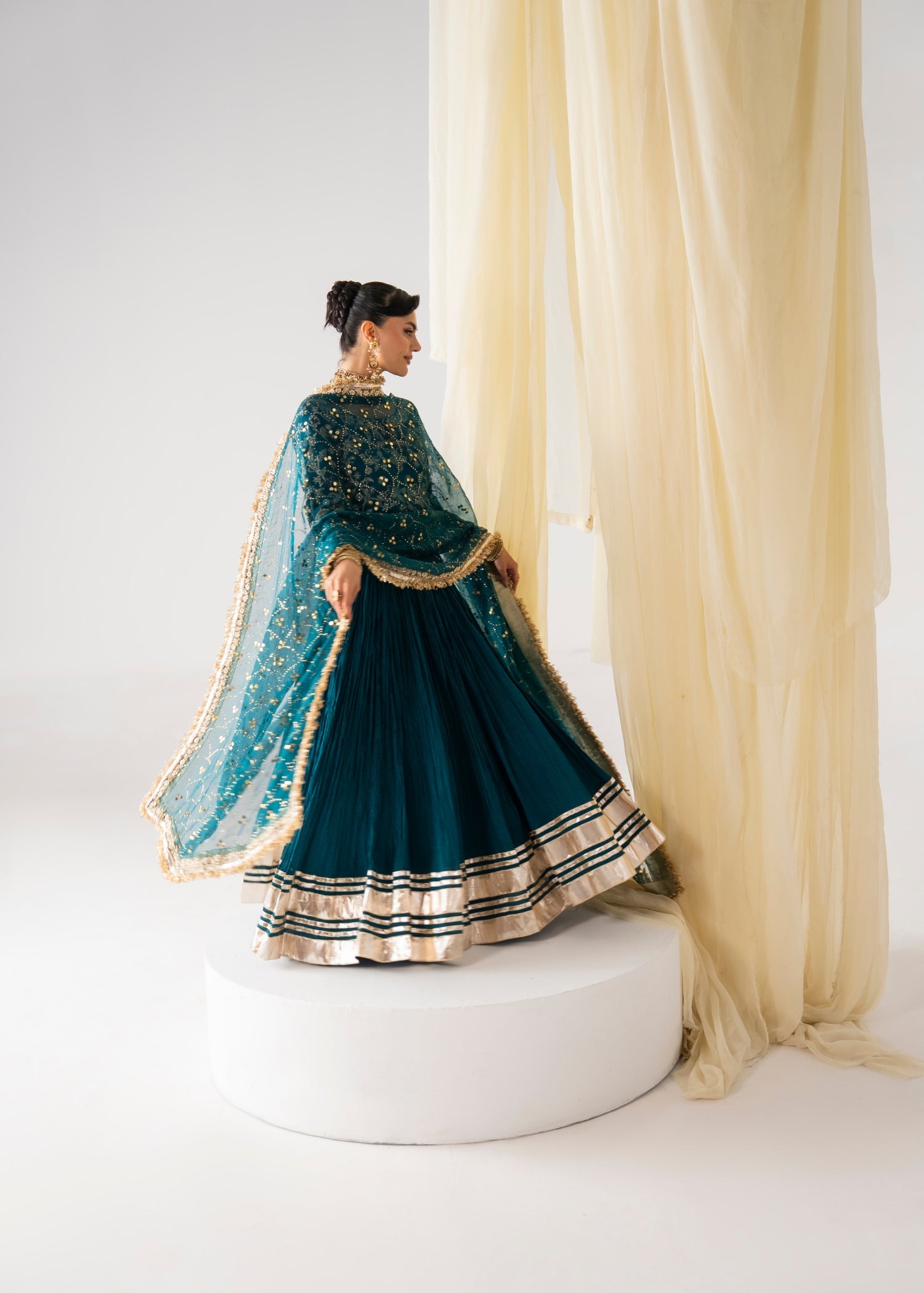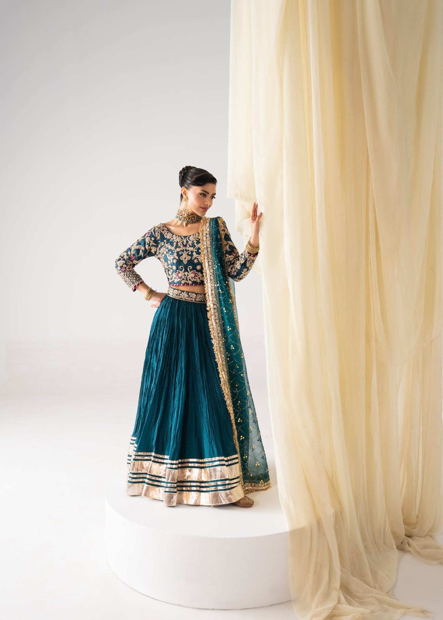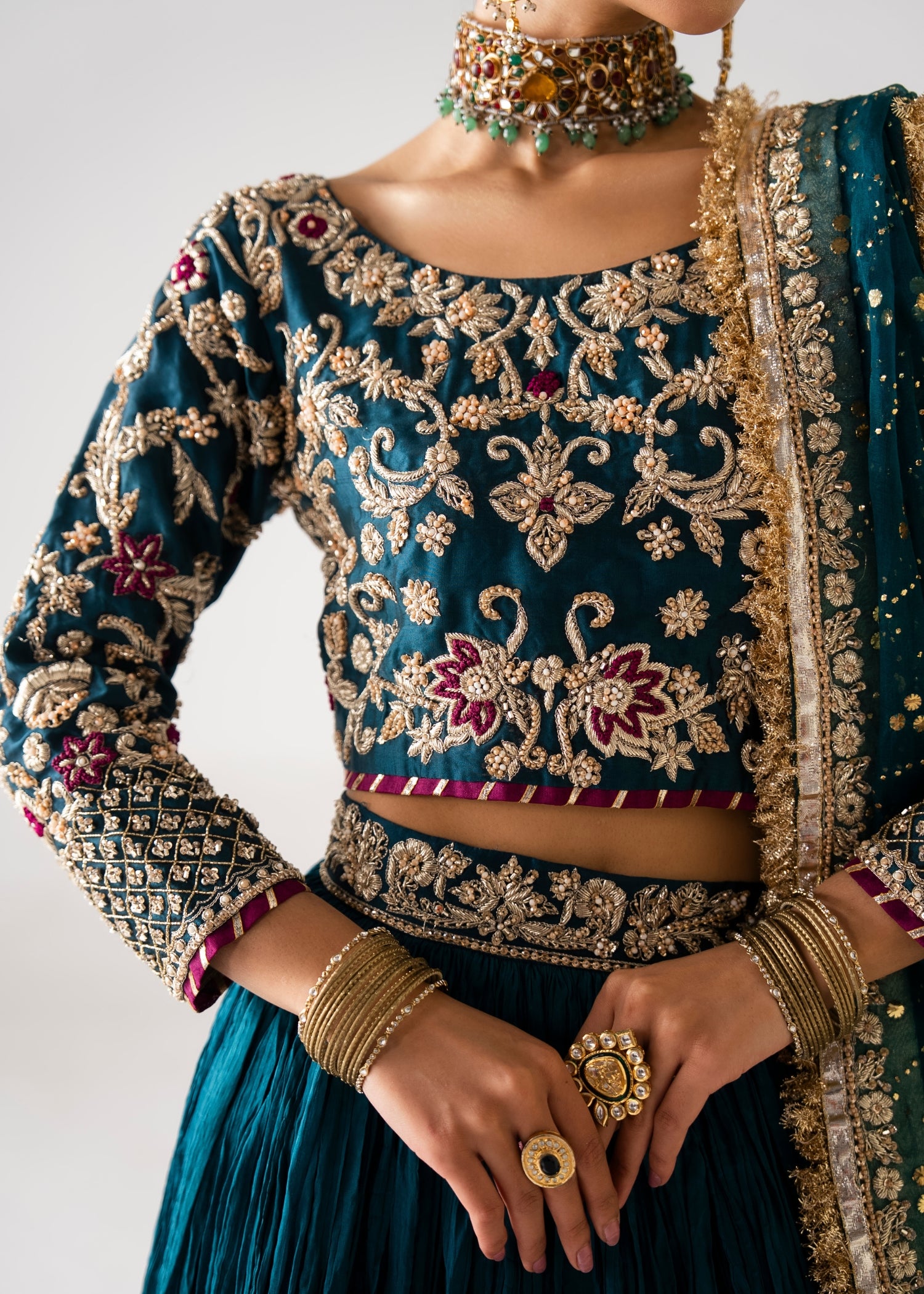 Silk-crush skirt paired with a heavily embellished silk blouse. Hand-embroidered belt for structure. Dupatta features zardozi, kora, dabka, Resham, gota, and mukaish work, finished with kiran edging. Includes a sheesha-worked silk blouse variation with organza dupatta