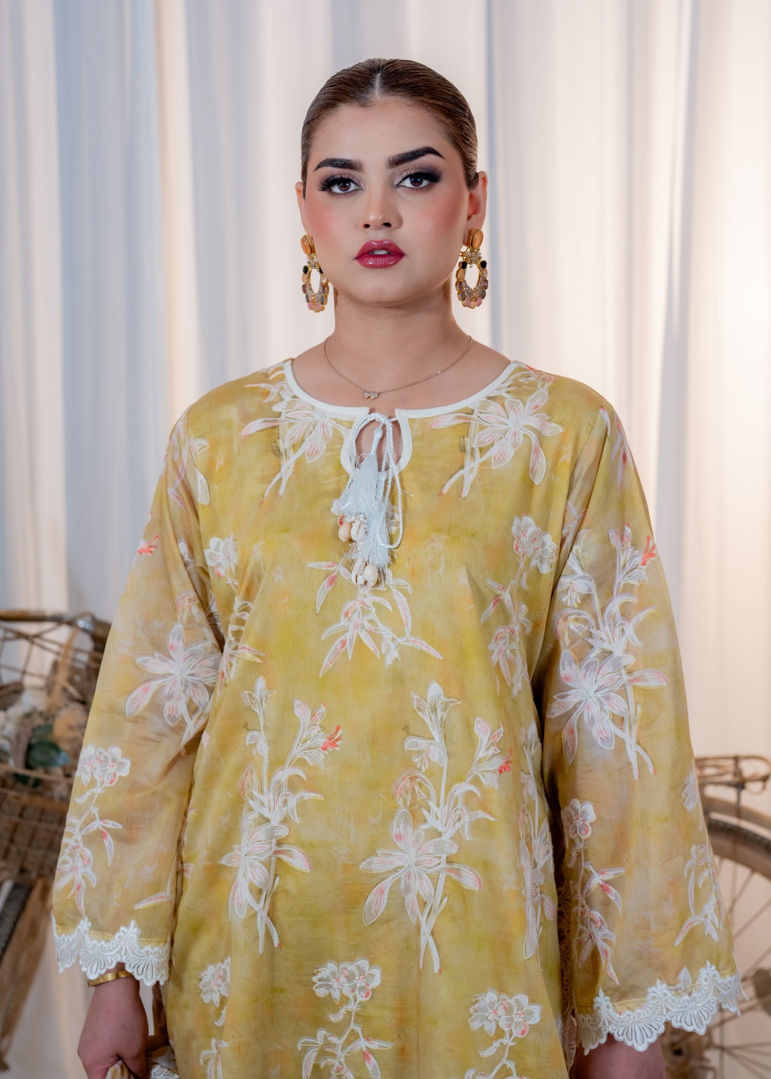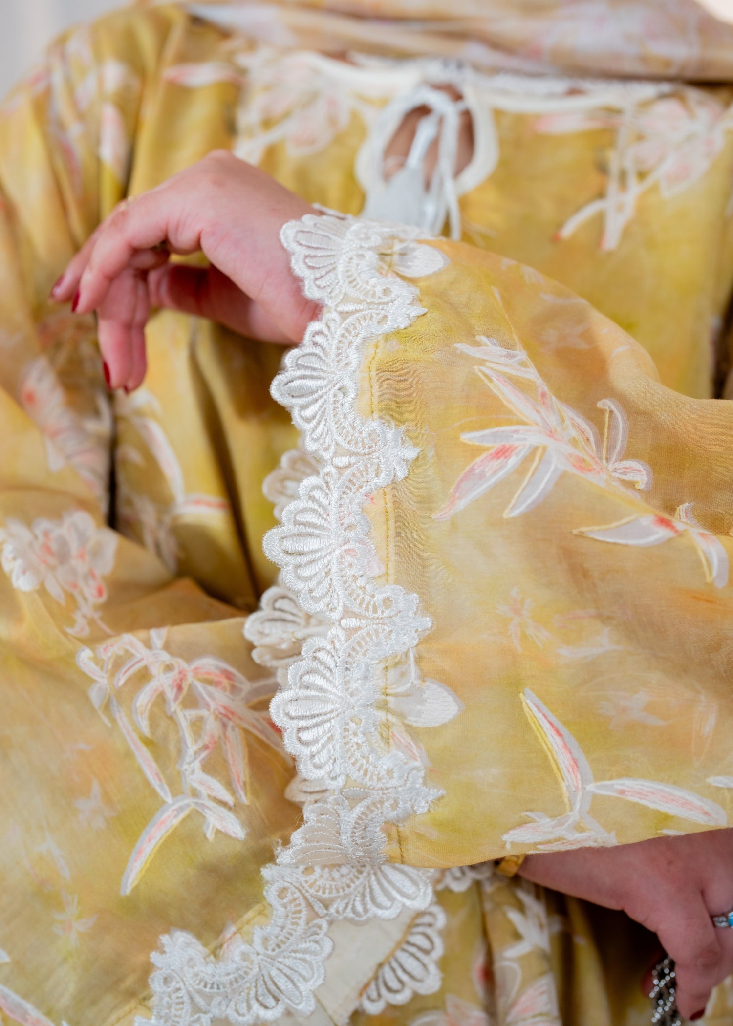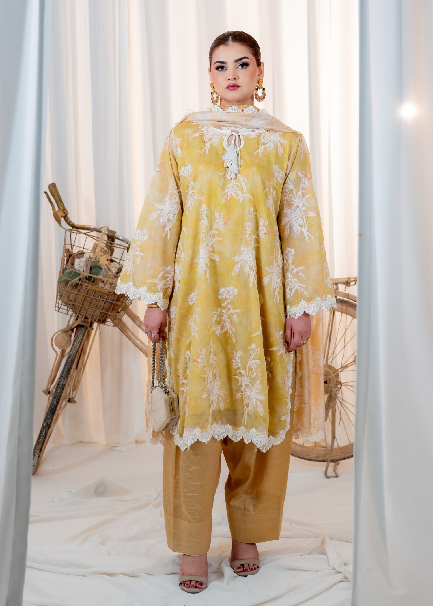 Three-piece set featuring an embroidered silk lawn shirt with bell sleeves and lace-detailed cuffs, raw silk shalwar, and a silk dupatta finished with embroidered scalloped edging. Accented with a front tassel at the neckline.