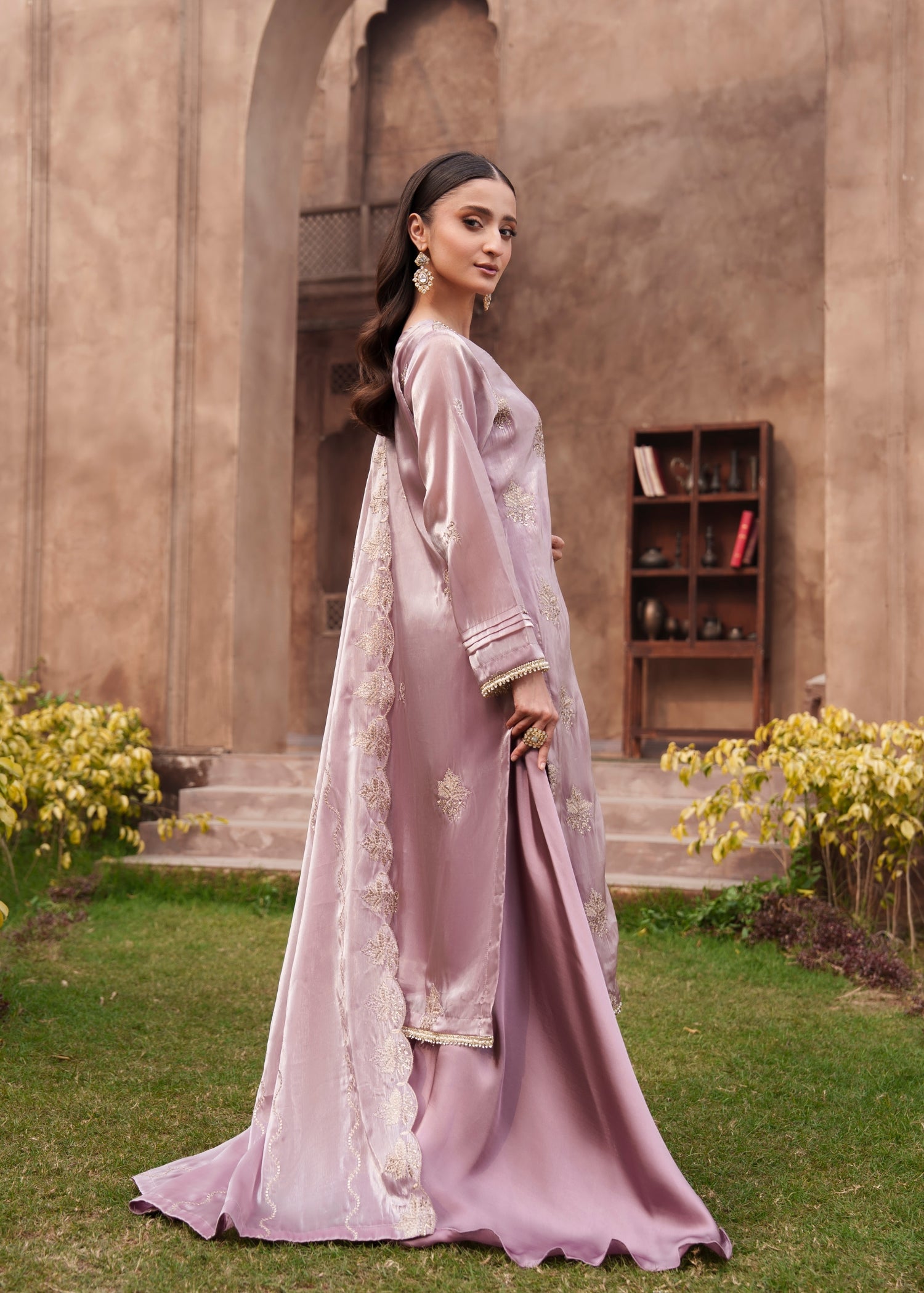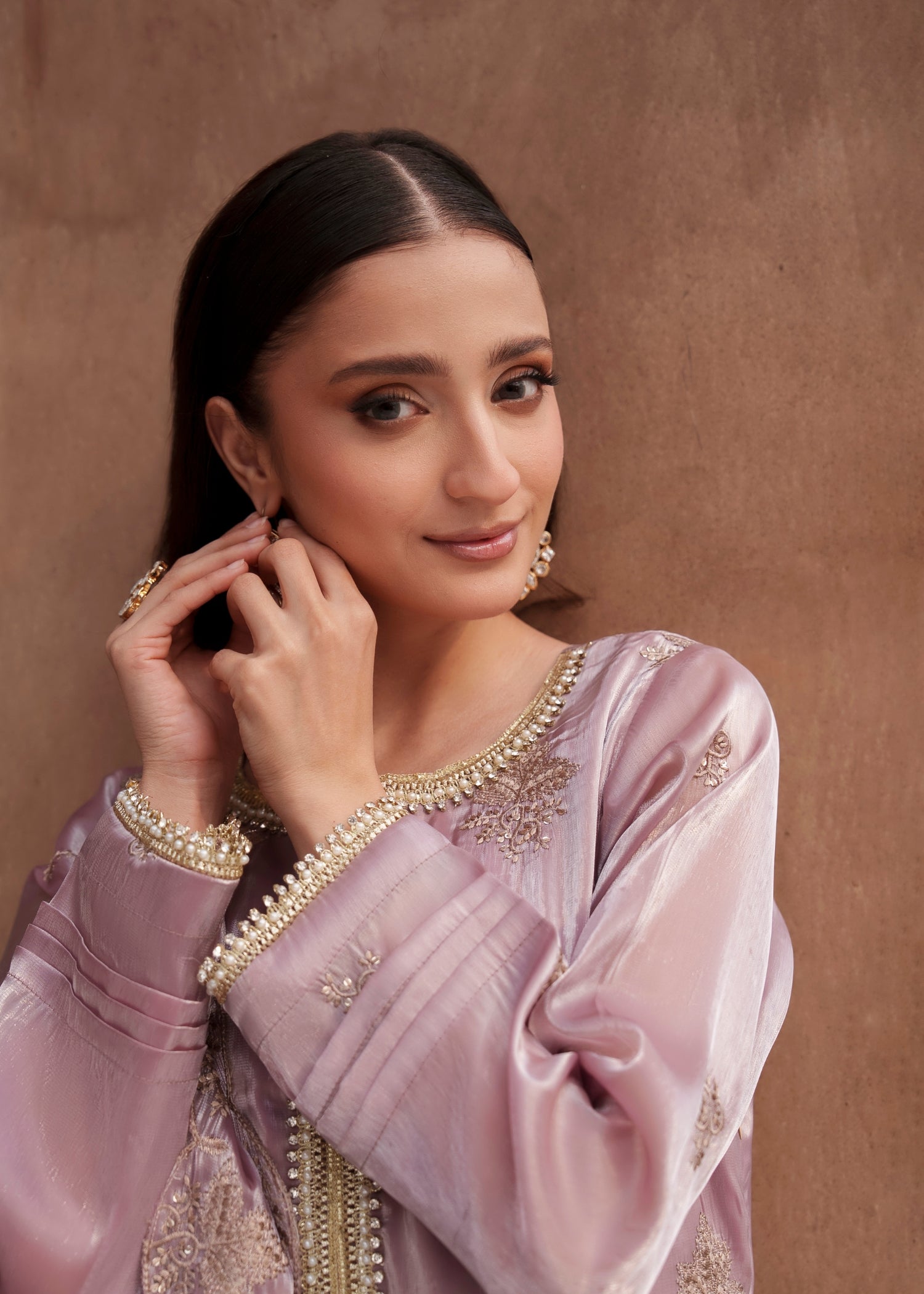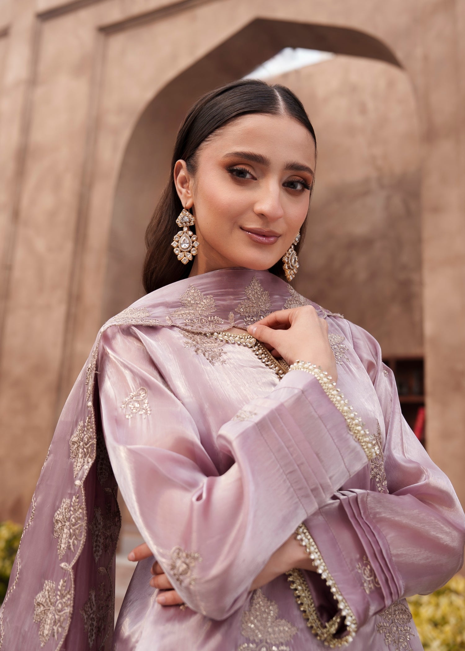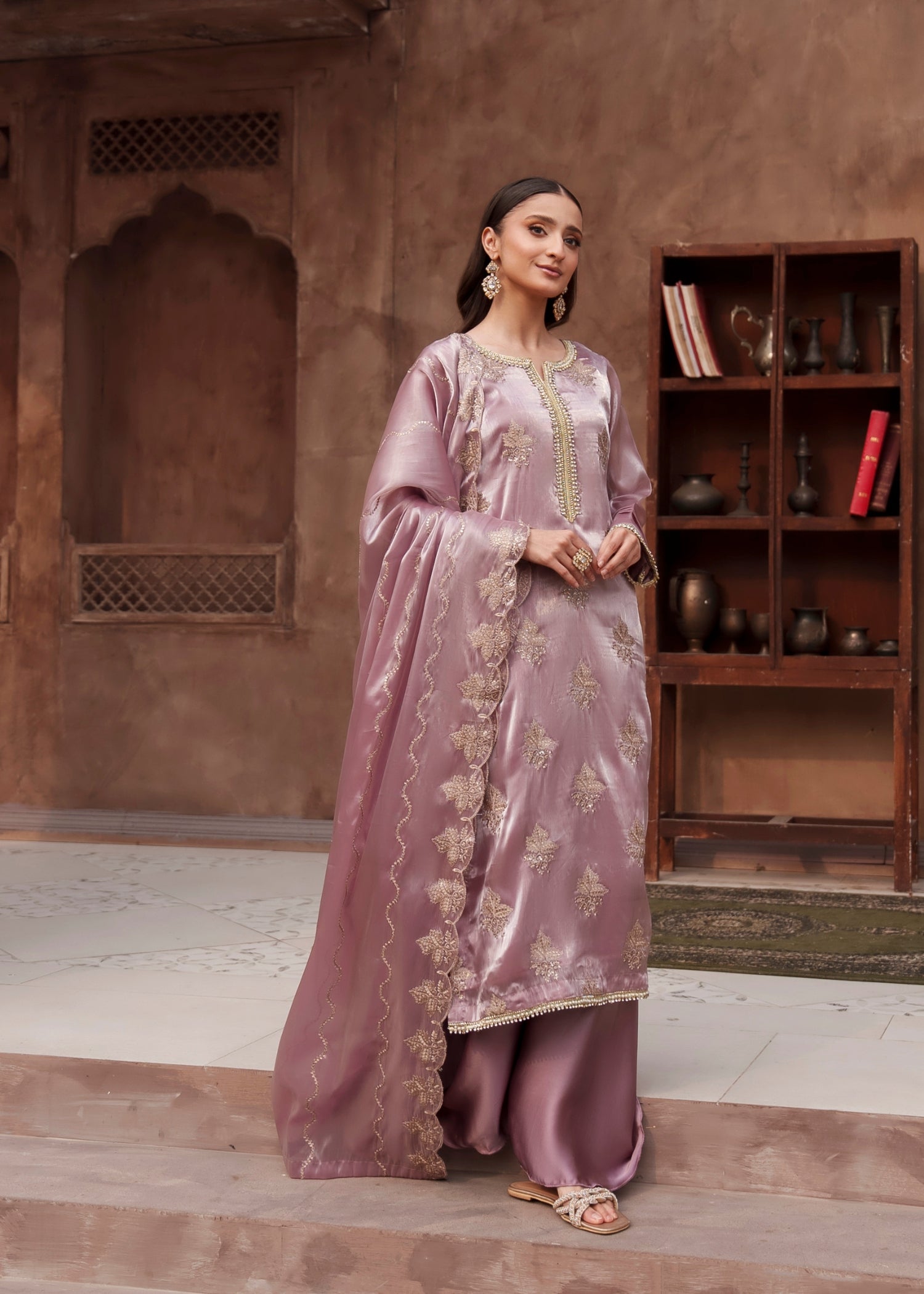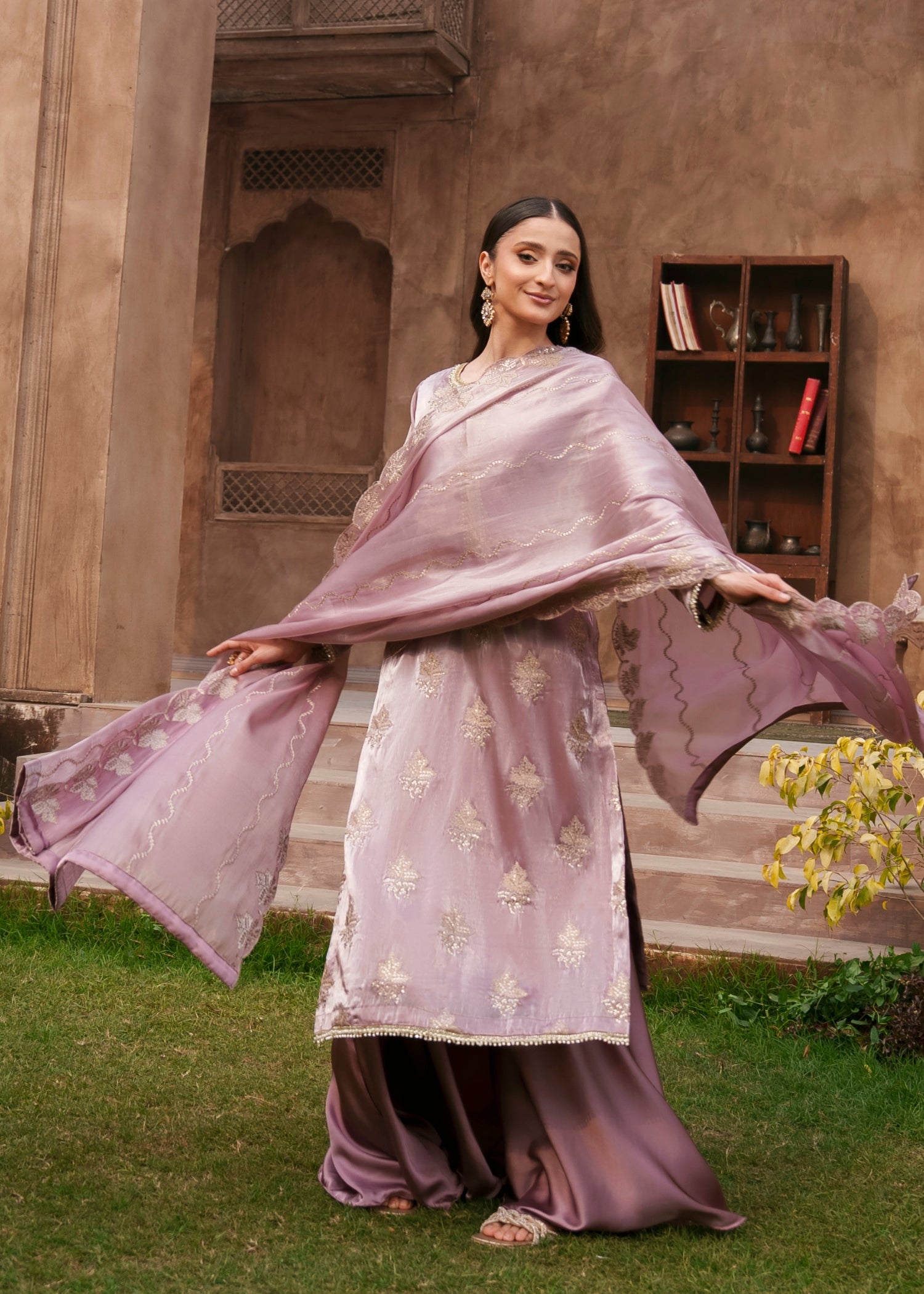 Sheesha silk shirt with silk palazzo or drape pants, dupatta with two-tone shine. Light, versatile, and comfortable.