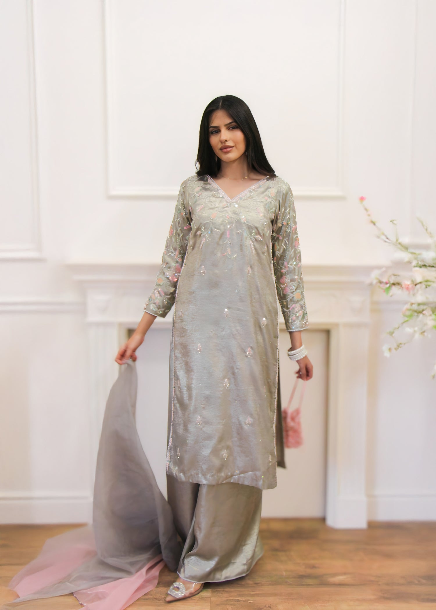 Hand-embellished zardozi with resham and sequins for subtle colour lift